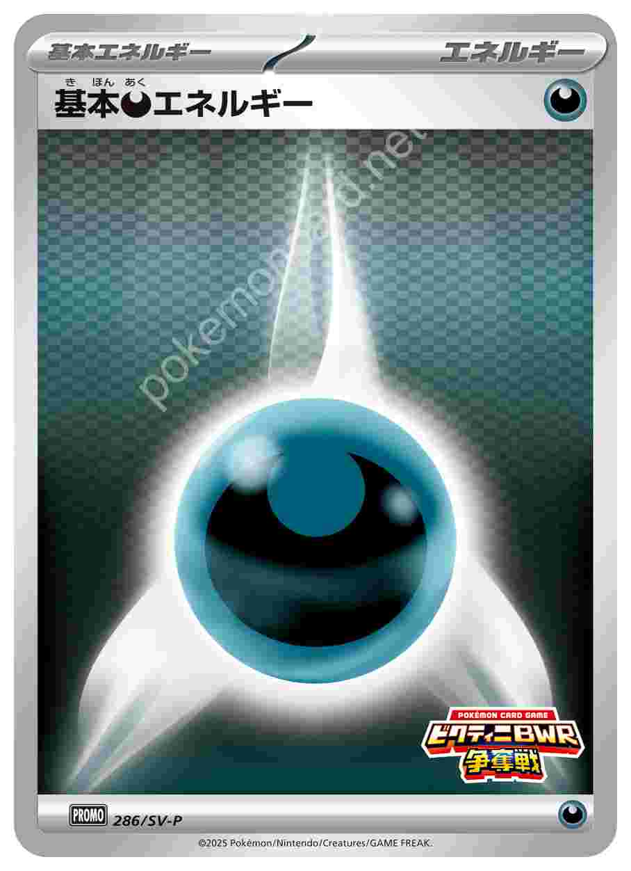 ![]() | 基本悪エネルギー | 基本エネルギー | 「ブラックボルト・ホワイトフレア」デッキ構築戦で使用可能なカード | ★★★ | 286/SV-P |
