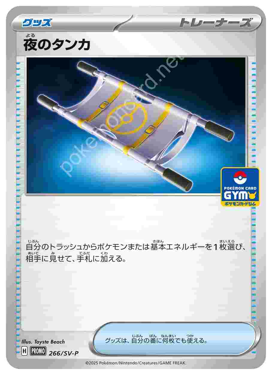 ![]() | 夜のタンカ | グッズ | 自分のトラッシュからポケモンまたは基本エネルギーを1枚選び、相手に見せて、手札に加える。グッズは、自分の番に何枚でも使える。 | スカーレット&バイオレット プロモカードパック第10弾 | ★★★ | 266/SV-P |