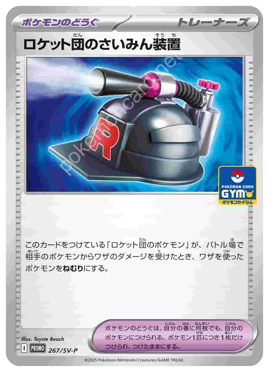 ![]() | ロケット団のさいみん装置 | ポケモンのどうぐ | このカードをつけている「ロケット団のポケモン」が、バトル場で相手のポケモンからワザのダメージを受けたとき、ワザを使ったポケモンをねむりにする。ポケモンのどうぐは、自分の番に何枚でも、自分のポケモンにつけられる。ポケモン1匹につき1枚だけつけられ、つけたままにする。 | スカーレット&バイオレット プロモカードパック第10弾 | ★★★ | 267/SV-P |