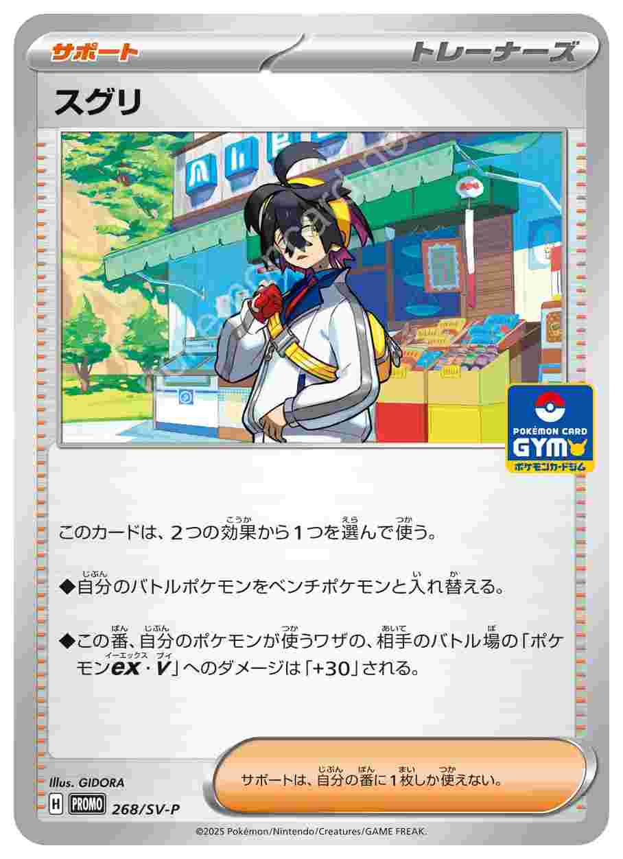 ![]() | スグリ | サポート | このカードは、2つの効果から1つを選んで使う。 ◆自分のバトルポケモンをベンチポケモンと入れ替える。 ◆この番、自分のポケモンが使うワザの、相手のバトル場の「ポケモンex・V」へのダメージは「+30」される。サポートは、自分の番に1枚しか使えない。 | スカーレット&バイオレット プロモカードパック第10弾 | ★★★ | 268/SV-P |