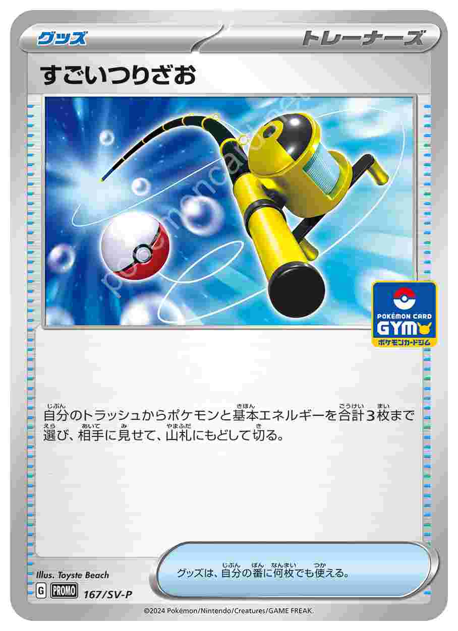 ![]() | すごいつりざお | グッズ | 自分のトラッシュからポケモンと基本エネルギーを合計3枚まで選び、相手に見せて、山札にもどして切る。グッズは、自分の番に何枚でも使える。 | スカーレット&バイオレット プロモカードパック第7弾 | ★★★ | 167/SV-P |