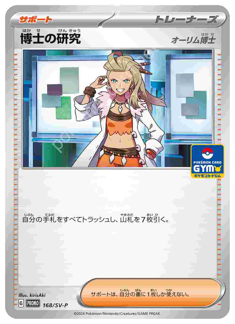 ![]() | 博士の研究 | サポート | 自分の手札をすべてトラッシュし、山札を7枚引く。サポートは、自分の番に1枚しか使えない。 | スカーレット&バイオレット プロモカードパック第7弾 | ★★★ | 168/SV-P |