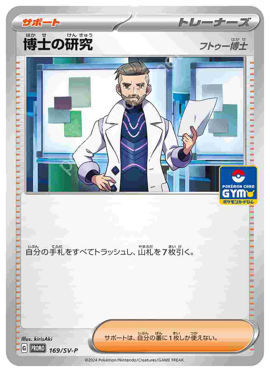 ![]() | 博士の研究 | サポート | 自分の手札をすべてトラッシュし、山札を7枚引く。サポートは、自分の番に1枚しか使えない。 | スカーレット&バイオレット プロモカードパック第7弾 | ★★★ | 169/SV-P |