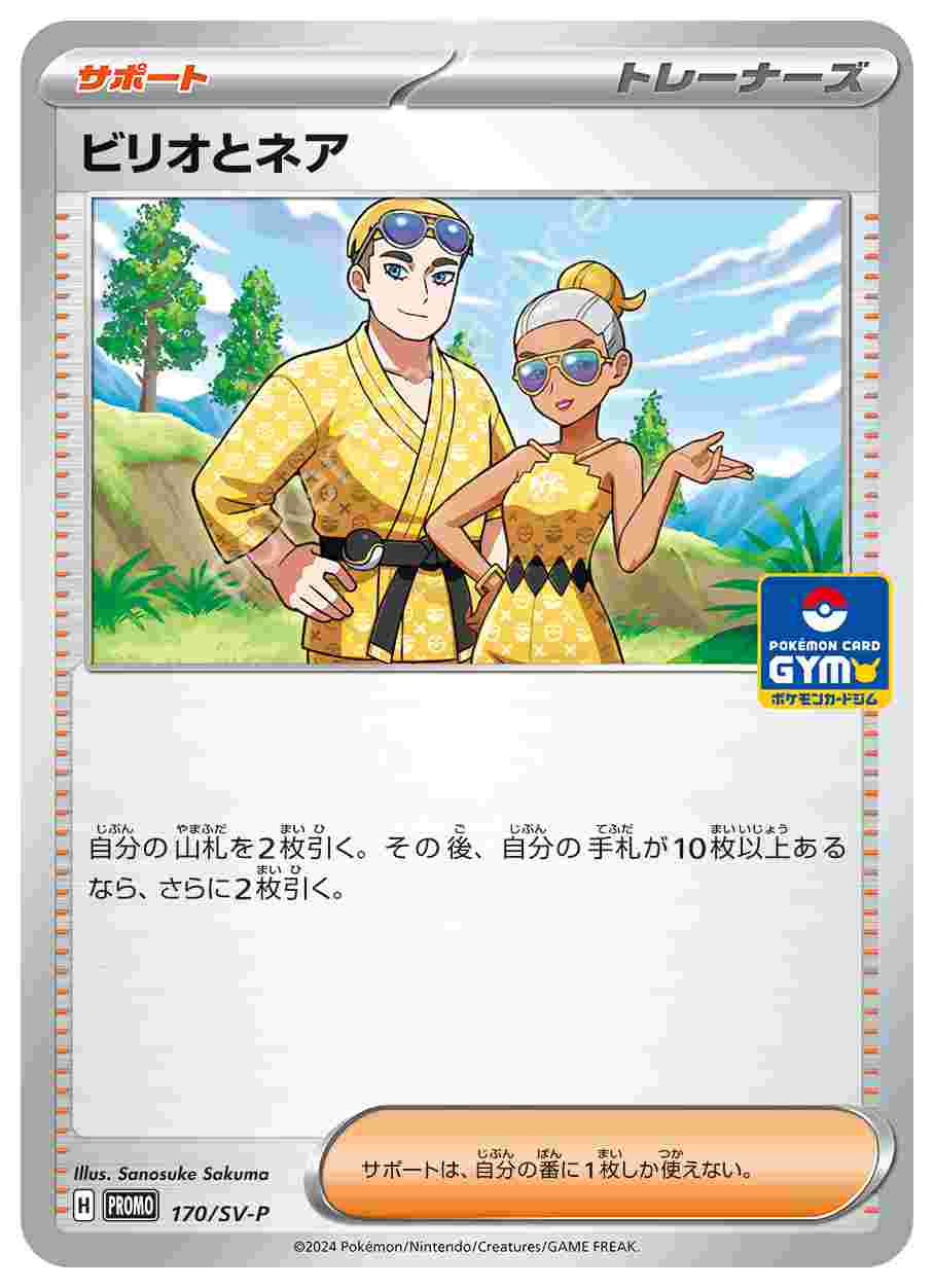 ![]() | ビリオとネア | サポート | 自分の山札を2枚引く。その後、自分の手札が10枚以上あるなら、さらに2枚引く。サポートは、自分の番に1枚しか使えない。 | スカーレット&バイオレット プロモカードパック第7弾 | ★★★ | 170/SV-P |