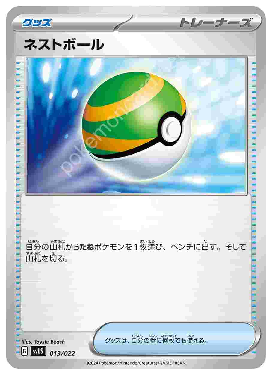![]() | ネストボール | グッズ | 自分の山札からたねポケモンを1枚選び、ベンチに出す。そして山札を切る。グッズは、自分の番に何枚でも使える。 | スターターセット テラスタイプ:ステラ ソウブレイズex | ★★★ | 013/022 |