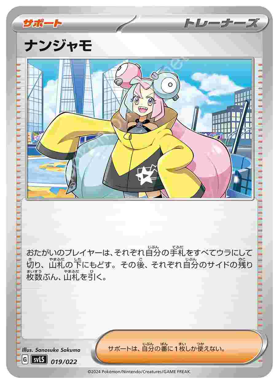 ![]() | ナンジャモ | サポート | おたがいのプレイヤーは、それぞれ自分の手札をすべてウラにして切り、山札の下にもどす。その後、それぞれ自分のサイドの残り枚数ぶん、山札を引く。サポートは、自分の番に1枚しか使えない。 | スターターセット テラスタイプ:ステラ ソウブレイズex | ★★★ | 019/022 |