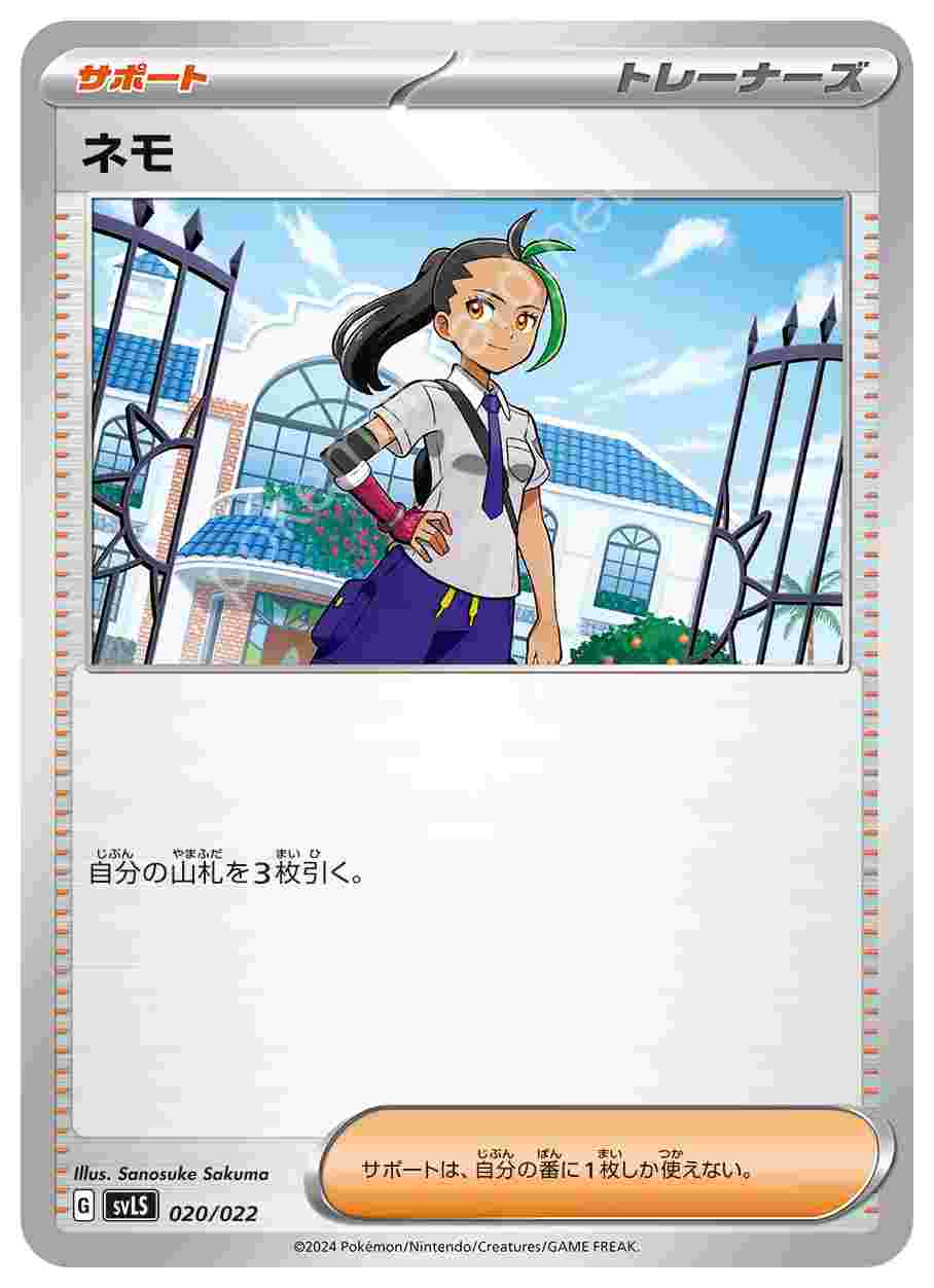 ![]() | ネモ | サポート | 自分の山札を3枚引く。サポートは、自分の番に1枚しか使えない。 | スターターセット テラスタイプ:ステラ ソウブレイズex | ★★★ | 020/022 |
