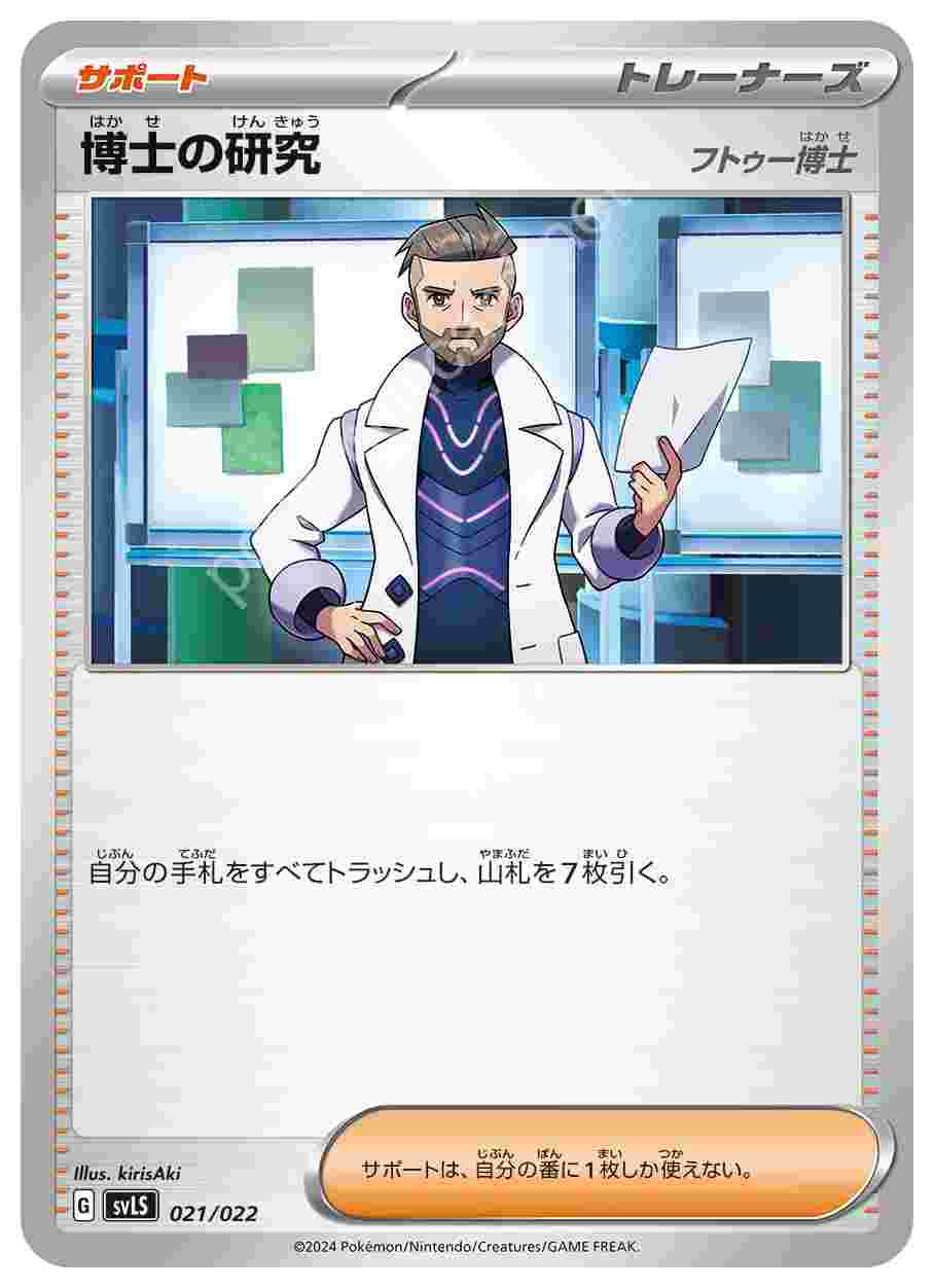 ![]() | 博士の研究 | サポート | 自分の手札をすべてトラッシュし、山札を7枚引く。サポートは、自分の番に1枚しか使えない。 | スターターセット テラスタイプ:ステラ ソウブレイズex | ★★★ | 021/022 |