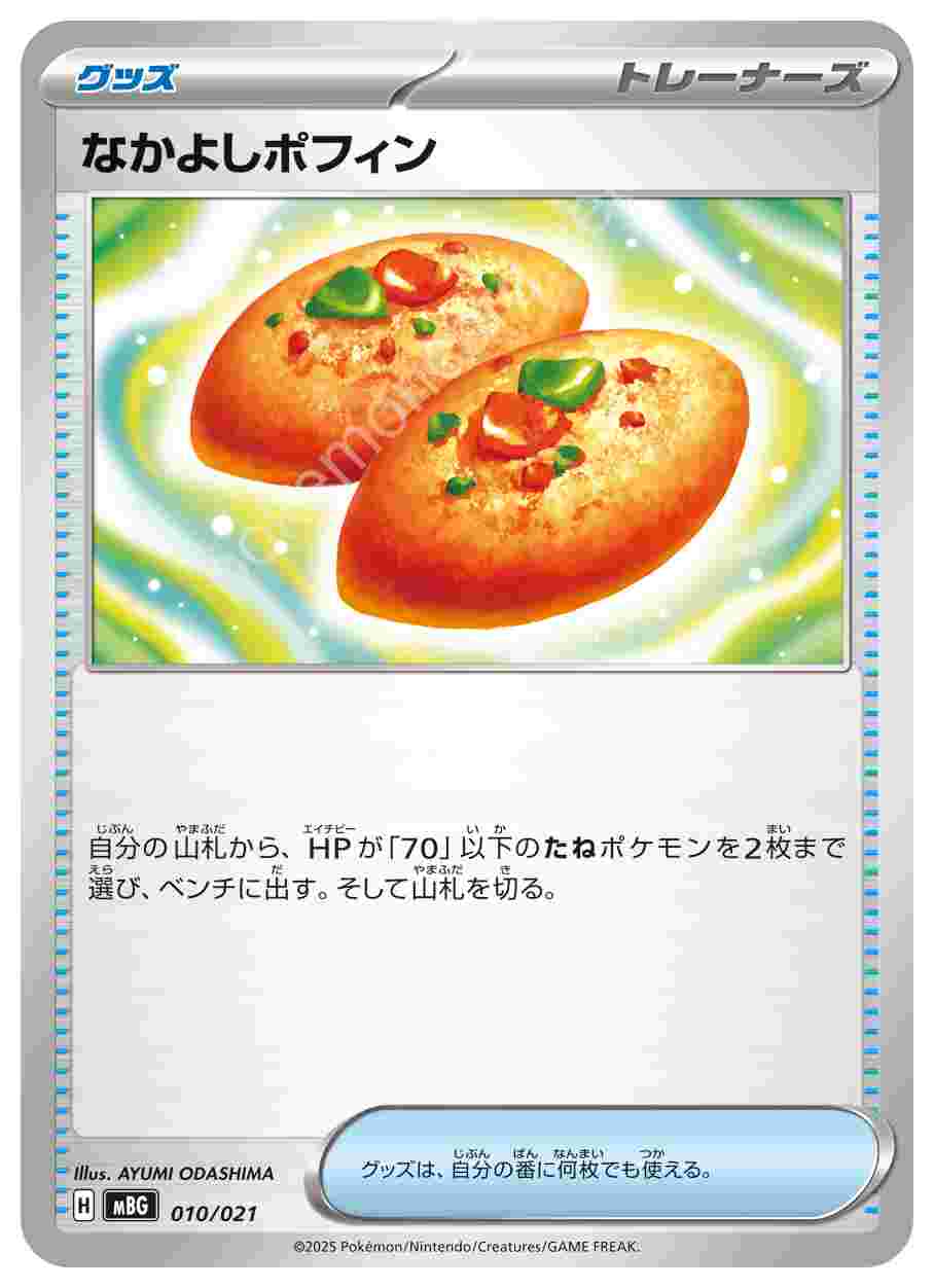 ![]() | なかよしポフィン | グッズ | 自分の山札から、HPが「70」以下のたねポケモンを2枚まで選び、ベンチに出す。そして山札を切る。グッズは、自分の番に何枚でも使える。 | スターターセットMEGA メガゲンガーex | ★★★ | 010/021 |