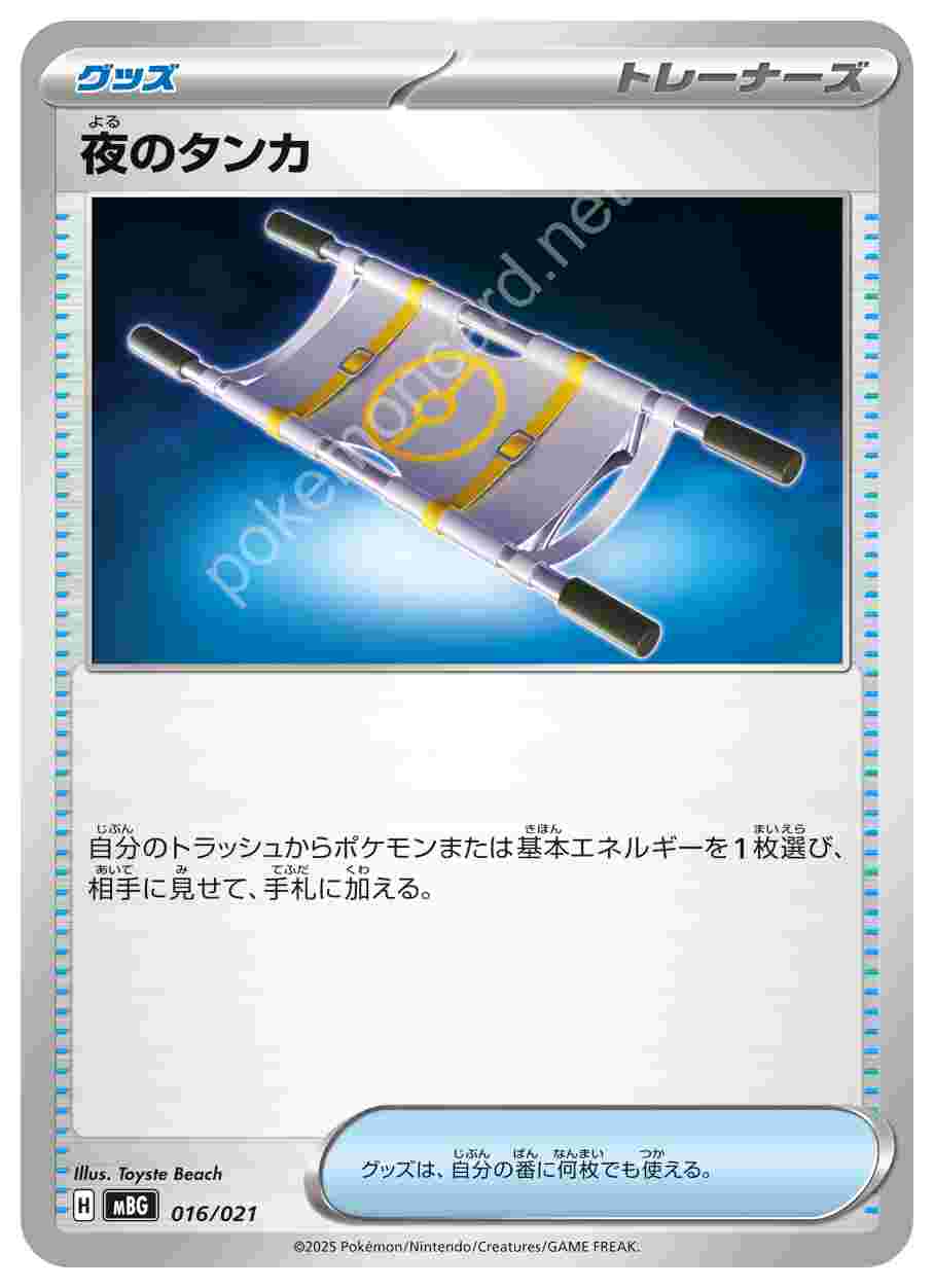 ![]() | 夜のタンカ | グッズ | 自分のトラッシュからポケモンまたは基本エネルギーを1枚選び、相手に見せて、手札に加える。グッズは、自分の番に何枚でも使える。 | スターターセットMEGA メガゲンガーex | ★★★ | 016/021 |