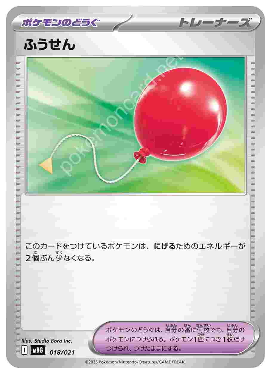 ![]() | ふうせん | ポケモンのどうぐ | このカードをつけているポケモンは、にげるためのエネルギーが2個ぶん少なくなる。ポケモンのどうぐは、自分の番に何枚でも、自分のポケモンにつけられる。ポケモン1匹につき1枚だけつけられ、つけたままにする。 | スターターセットMEGA メガゲンガーex | ★★★ | 018/021 |