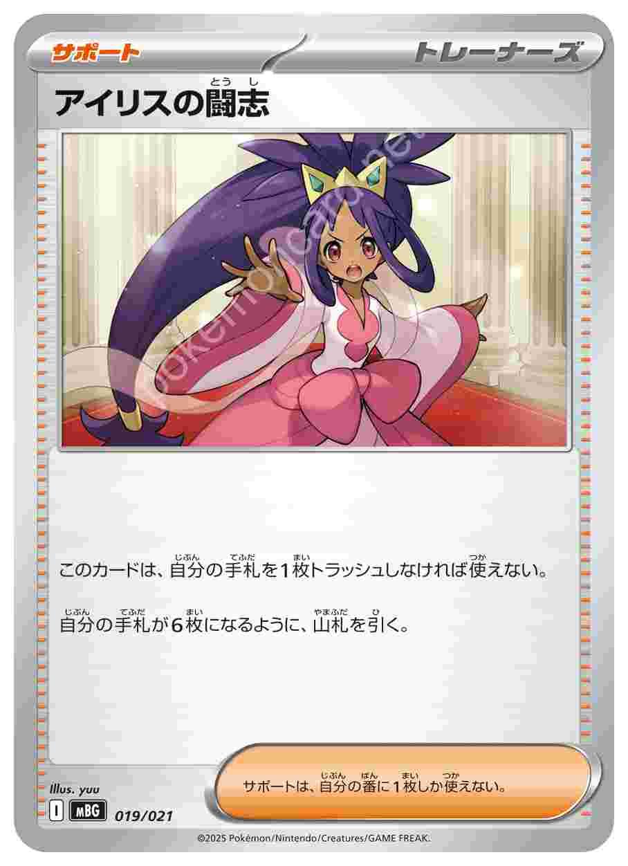 ![]() | アイリスの闘志 | サポート | このカードは、自分の手札を1枚トラッシュしなければ使えない。 自分の手札が6枚になるように、山札を引く。サポートは、自分の番に1枚しか使えない。 | スターターセットMEGA メガゲンガーex | ★★★ | 019/021 |