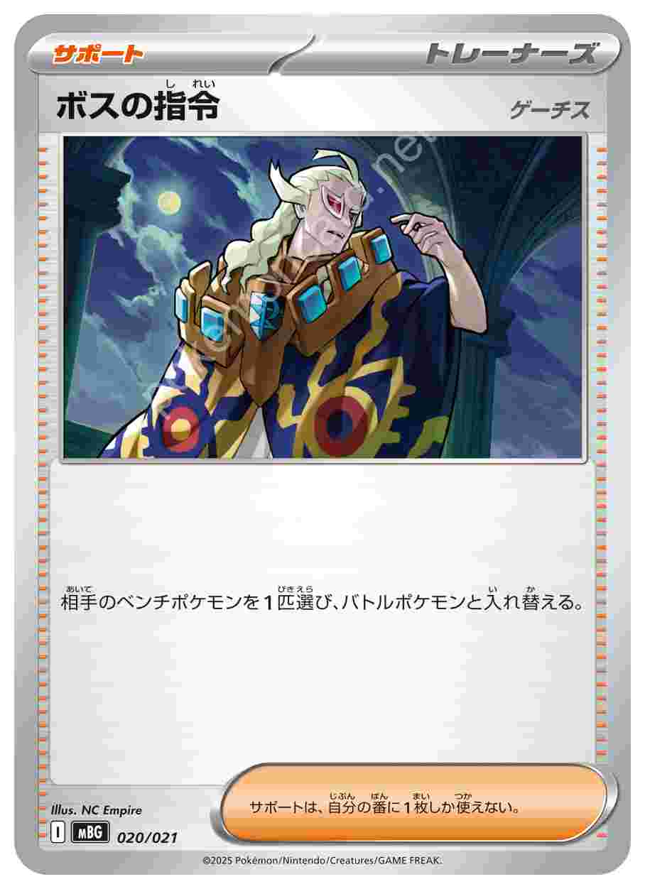 ![]() | ボスの指令 | サポート | 相手のベンチポケモンを1匹選び、バトルポケモンと入れ替える。サポートは、自分の番に1枚しか使えない。 | スターターセットMEGA メガゲンガーex | ★★★ | 020/021 |