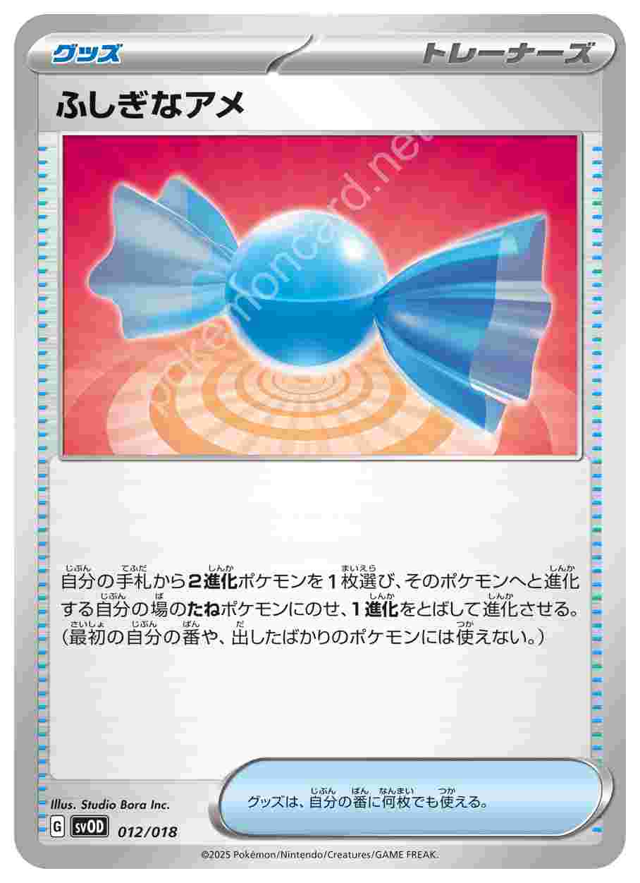 ![]() | ふしぎなアメ | グッズ | 自分の手札から2進化ポケモンを1枚選び、そのポケモンへと進化する自分の場のたねポケモンにのせ、1進化をとばして進化させる。(最初の自分の番や、出したばかりのポケモンには使えない。)グッズは、自分の番に何枚でも使える。 | スターターセットex ダイゴのダンバル&メタグロスex | ★★★ | 012/018 |