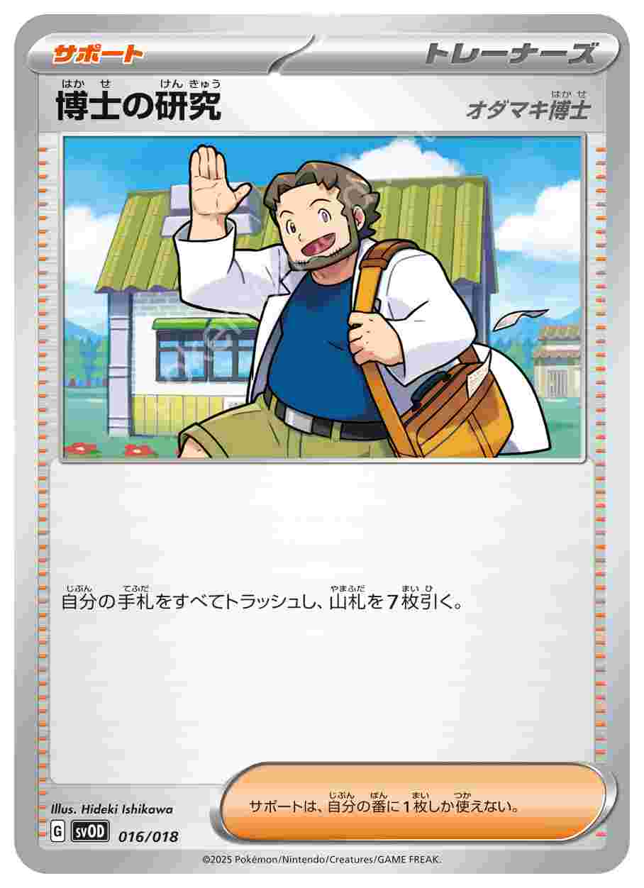 ![]() | 博士の研究 | サポート | 自分の手札をすべてトラッシュし、山札を7枚引く。サポートは、自分の番に1枚しか使えない。 | スターターセットex ダイゴのダンバル&メタグロスex | ★★★ | 016/018 |