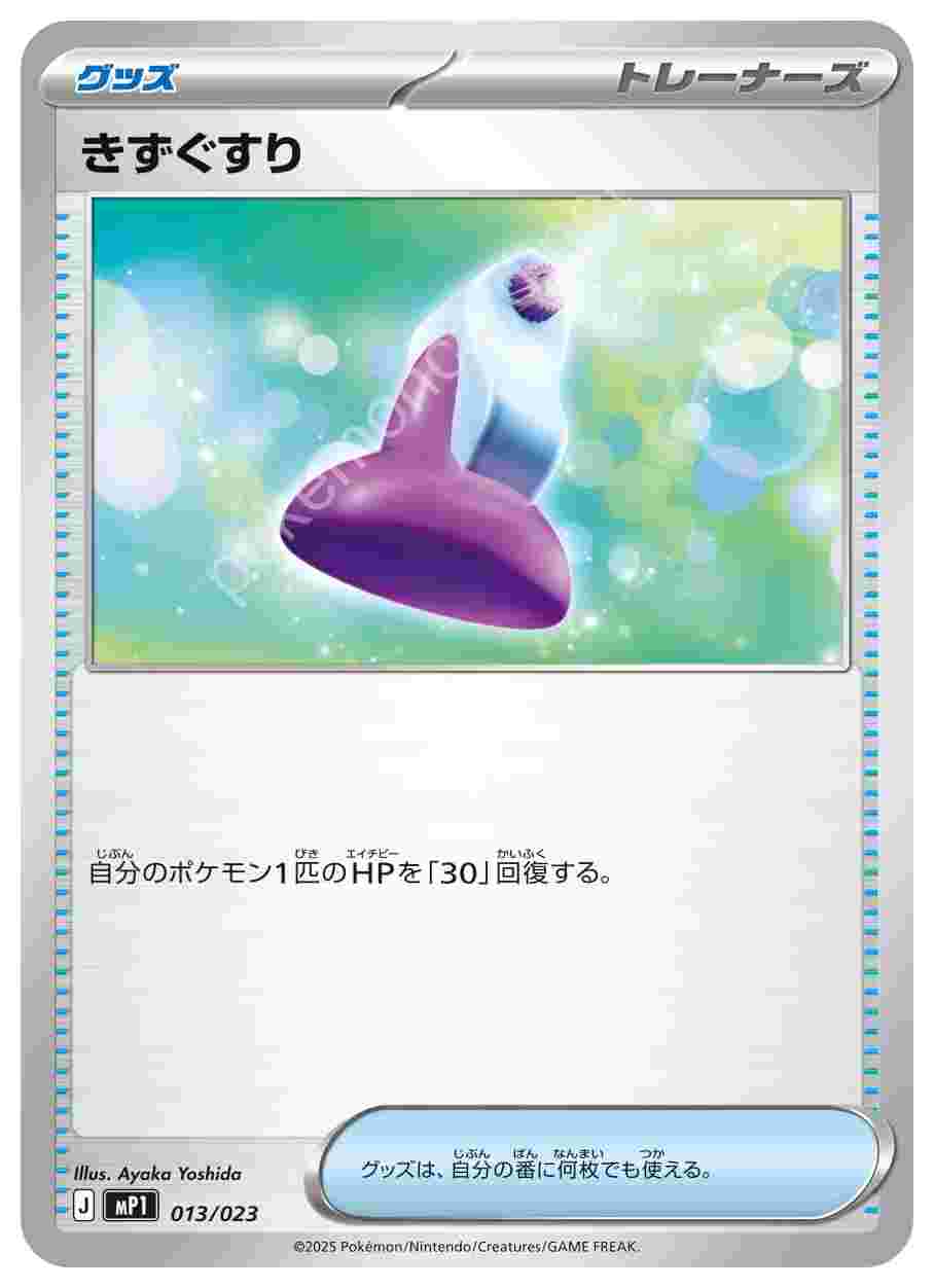 ![]() | きずぐすり | グッズ | 自分のポケモン1匹のHPを「30」回復する。グッズは、自分の番に何枚でも使える。 | スタートデッキ100 バトルコレクション コロちゃおVer. | ★★★ | 013/023 |