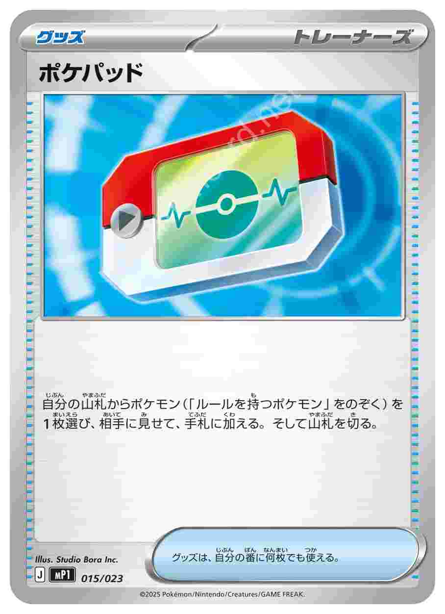 ![]() | ポケパッド | グッズ | 自分の山札からポケモン(「ルールを持つポケモン」をのぞく)を1枚選び、相手に見せて、手札に加える。そして山札を切る。グッズは、自分の番に何枚でも使える。 | スタートデッキ100 バトルコレクション コロちゃおVer. | ★★★ | 015/023 |