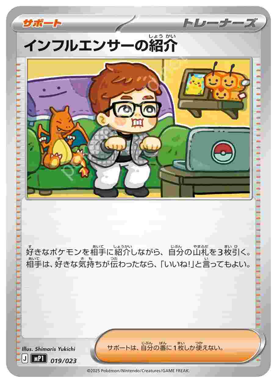 ![]() | インフルエンサーの紹介 | サポート | 好きなポケモンを相手に紹介しながら、自分の山札を3枚引く。相手は、好きな気持ちが伝わったなら、「いいね!」と言ってもよい。サポートは、自分の番に1枚しか使えない。 | スタートデッキ100 バトルコレクション コロちゃおVer. | ★★★ | 019/023 |
