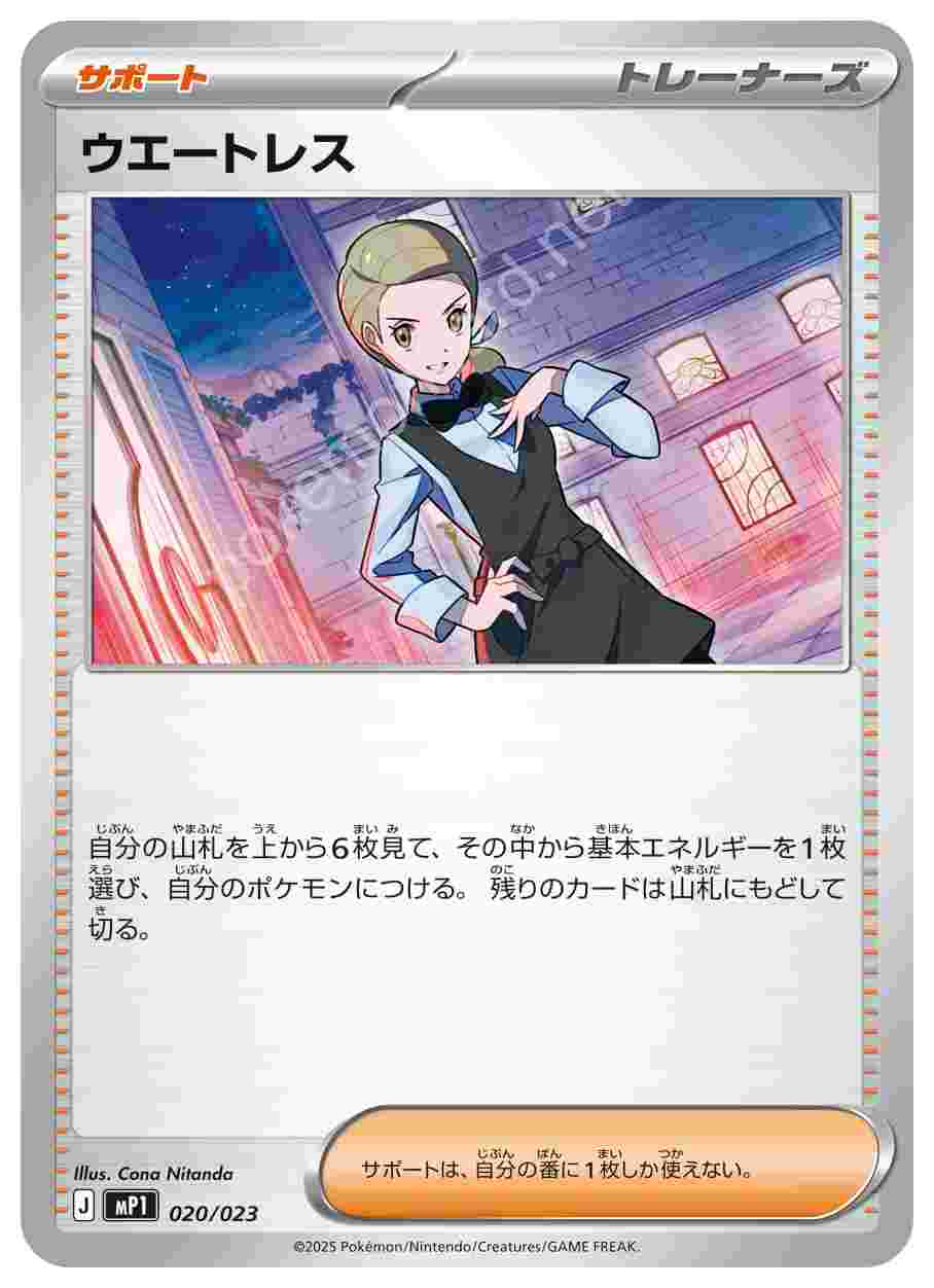 ![]() | ウエートレス | サポート | 自分の山札を上から6枚見て、その中から基本エネルギーを1枚選び、自分のポケモンにつける。残りのカードは山札にもどして切る。サポートは、自分の番に1枚しか使えない。 | スタートデッキ100 バトルコレクション コロちゃおVer. | ★★★ | 020/023 |