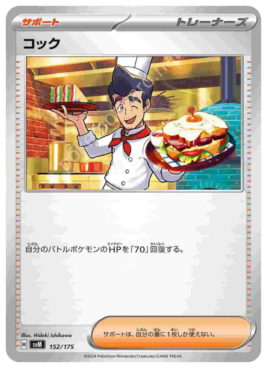![]() | コック | サポート | 自分のバトルポケモンのHPを「70」回復する。サポートは、自分の番に1枚しか使えない。 | スタートデッキGenerations ザシアンex・マホイップex スタートデッキ Generations | ★★★ | 152/175 |