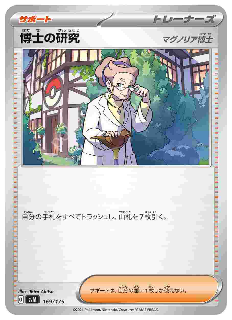 ![]() | 博士の研究 | サポート | 自分の手札をすべてトラッシュし、山札を7枚引く。サポートは、自分の番に1枚しか使えない。 | スタートデッキGenerations ザシアンex・マホイップex スタートデッキ Generations | ★★★ | 169/175 |