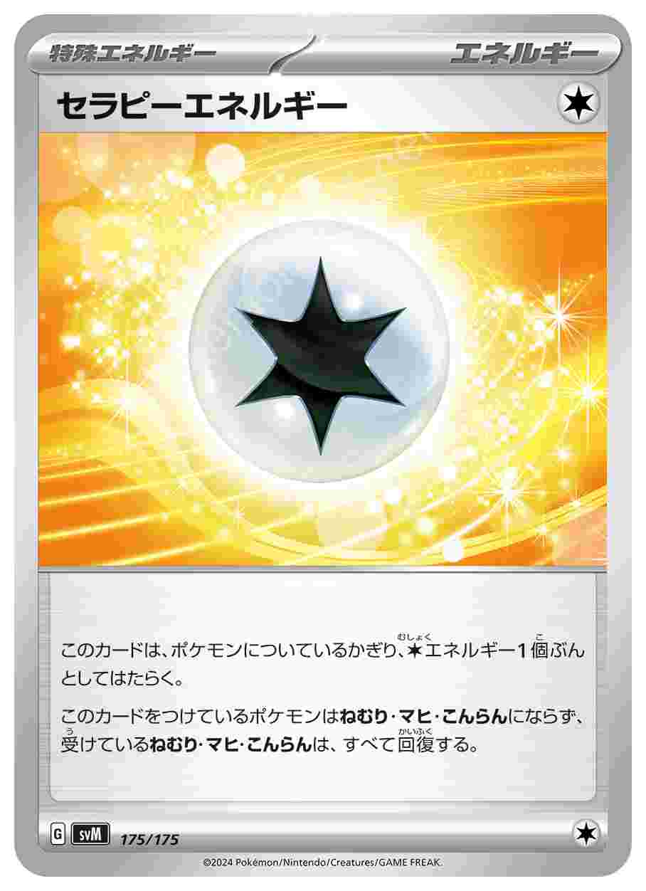 ![]() | セラピーエネルギー | 特殊エネルギー | このカードは、ポケモンについているかぎり、 このカードをつけているポケモンはねむり・マヒ・こんらんにならず、受けているねむり・マヒ・こんらんは、すべて回復する。 | スタートデッキGenerations ザシアンex・マホイップex スタートデッキ Generations | ★★★ | 175/175 |