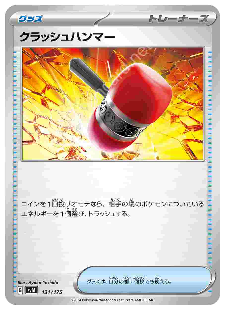 ![]() | クラッシュハンマー | グッズ | コインを1回投げオモテなら、相手の場のポケモンについているエネルギーを1個選び、トラッシュする。グッズは、自分の番に何枚でも使える。 | スタートデッキGenerations ルギアex・バンギラスex スタートデッキ Generations | ★★★ | 131/175 |
