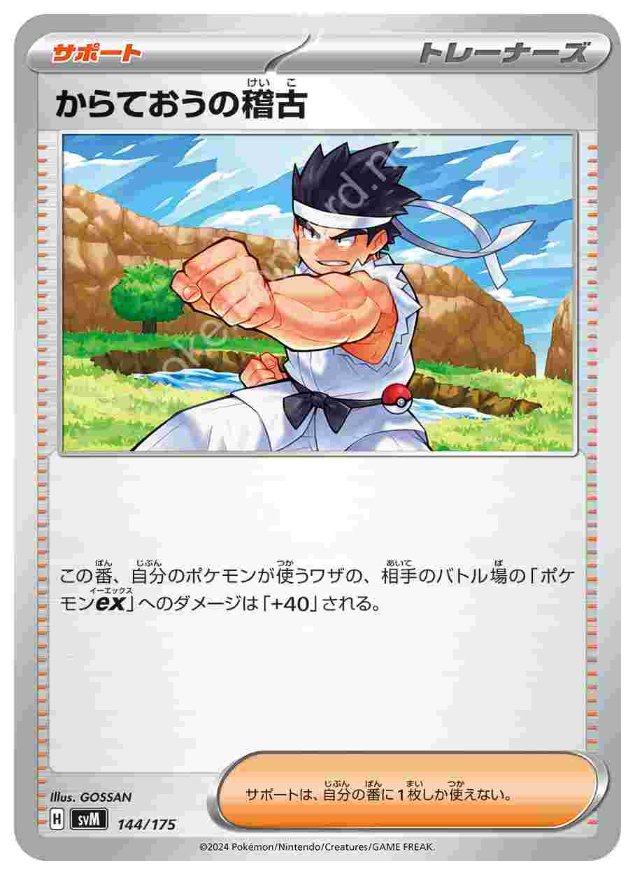 ![]() | からておうの稽古 | サポート | この番、自分のポケモンが使うワザの、相手のバトル場の「ポケモンex」へのダメージは「+40」される。サポートは、自分の番に1枚しか使えない。 | スタートデッキGenerations ルギアex・バンギラスex スタートデッキ Generations | ★★★ | 144/175 |