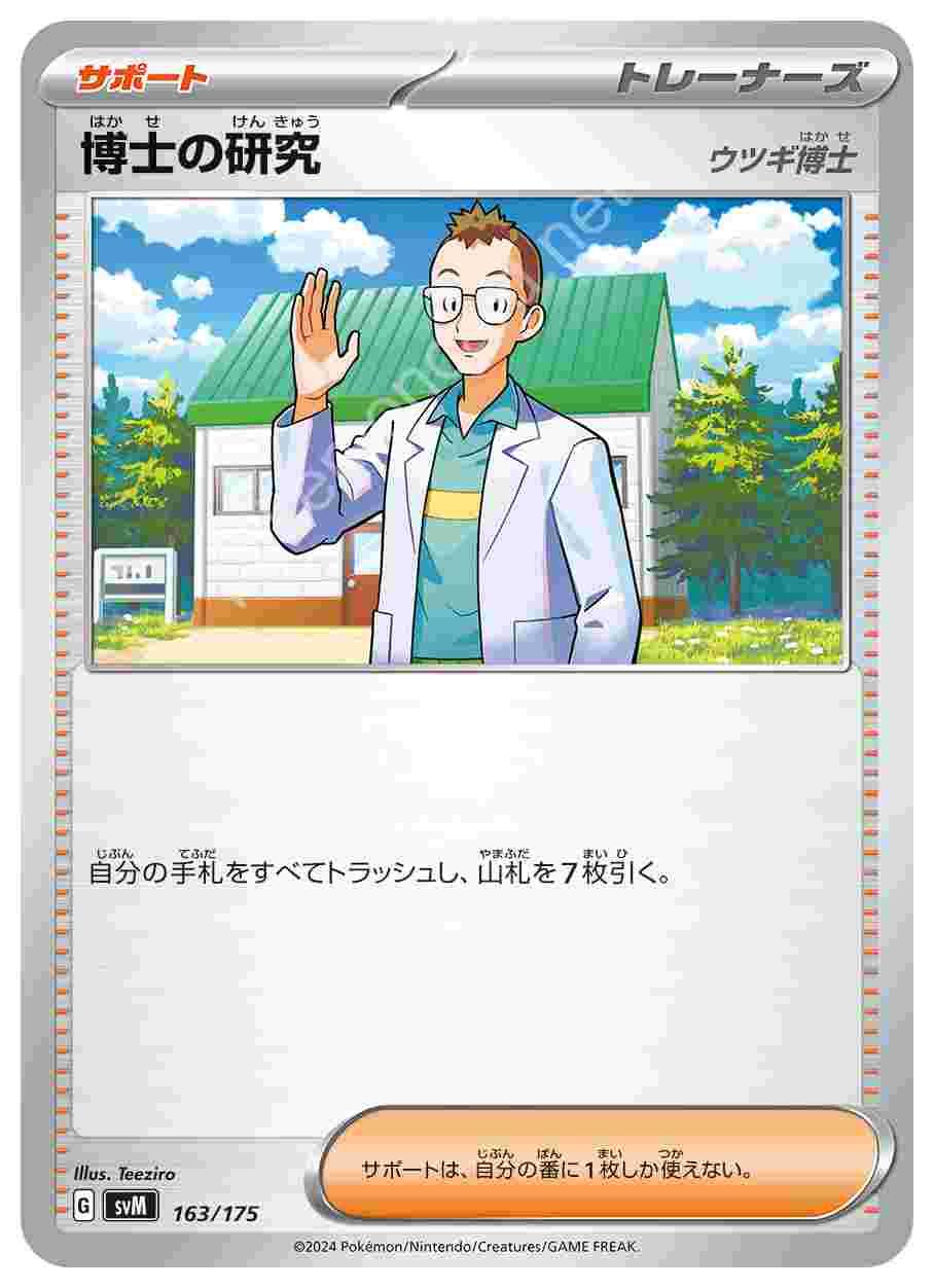 ![]() | 博士の研究 | サポート | 自分の手札をすべてトラッシュし、山札を7枚引く。サポートは、自分の番に1枚しか使えない。 | スタートデッキGenerations ルギアex・バンギラスex スタートデッキ Generations | ★★★ | 163/175 |