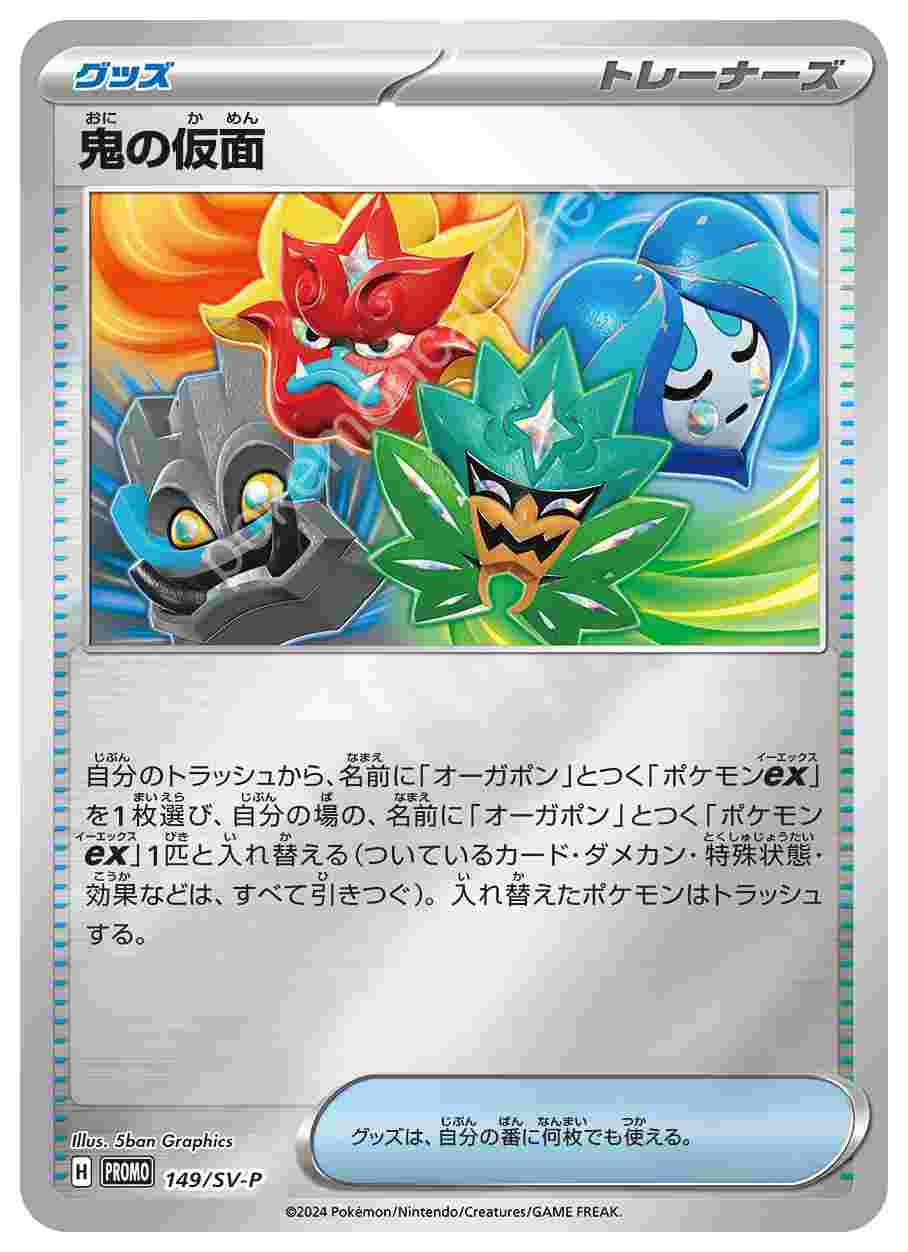 自分のトラッシュから、名前に「オーガポン」とつく「ポケモンex」を1枚選び、自分の場の、名前に「オーガポン」とつく「ポケモンex」1匹と入れ替える(ついているカード・ダメカン・特殊状態・効果などは、すべて引きつぐ)。入れ替えたポケモンはトラッシュする。グッズは、自分の番に何枚でも使える。