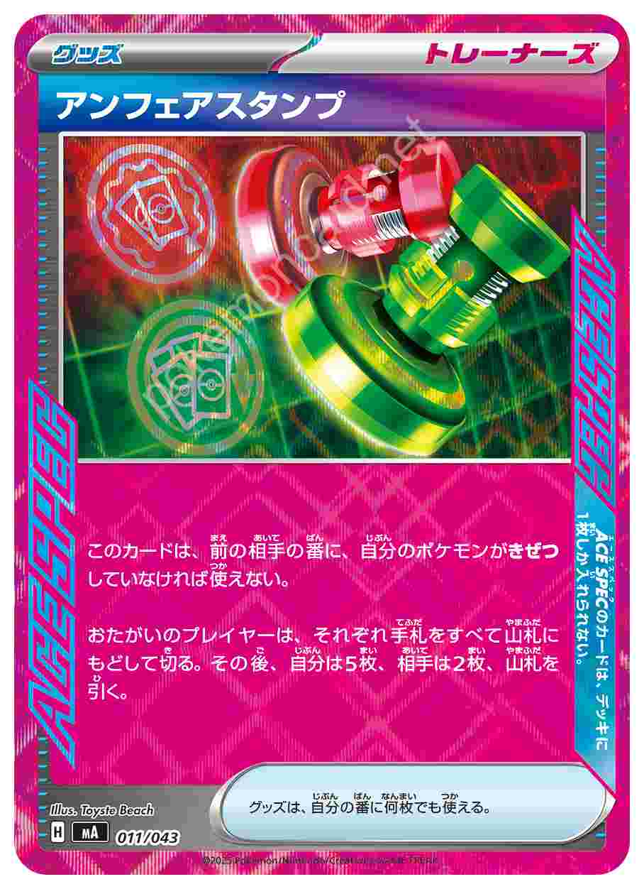 ![]() | アンフェアスタンプ | グッズ | このカードは、前の相手の番に、自分のポケモンがきぜつしていなければ使えない。 おたがいのプレイヤーは、それぞれ手札をすべて山札にもどして切る。その後、自分は5枚、相手は2枚、山札を引く。グッズは、自分の番に何枚でも使える。 特別なルール ACE SPECのカードは、デッキに1枚しか入れられない。ACE SPECのカードは、デッキに1枚しか入れられない。 | プレミアムトレーナーボックスMEGA | ★★★ | 011/043 |