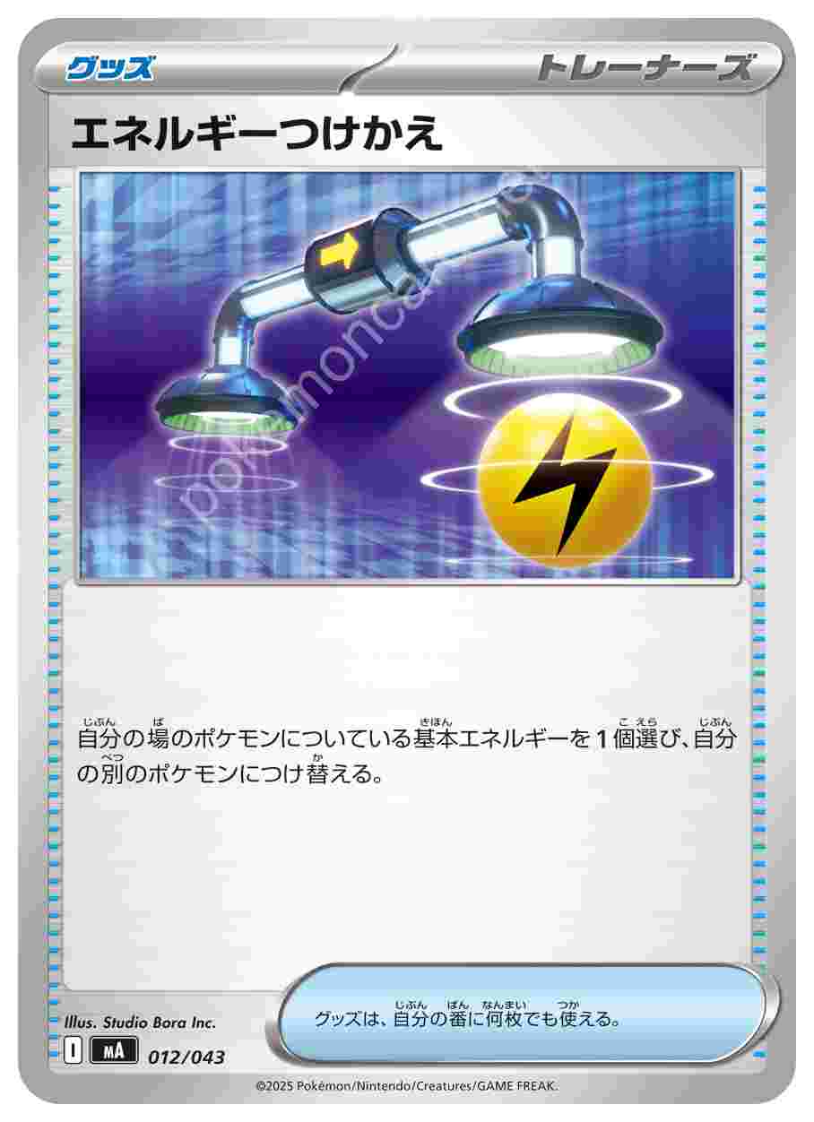 ![]() | エネルギーつけかえ | グッズ | 自分の場のポケモンについている基本エネルギーを1個選び、自分の別のポケモンにつけ替える。グッズは、自分の番に何枚でも使える。 | プレミアムトレーナーボックスMEGA | ★★★ | 012/043 |