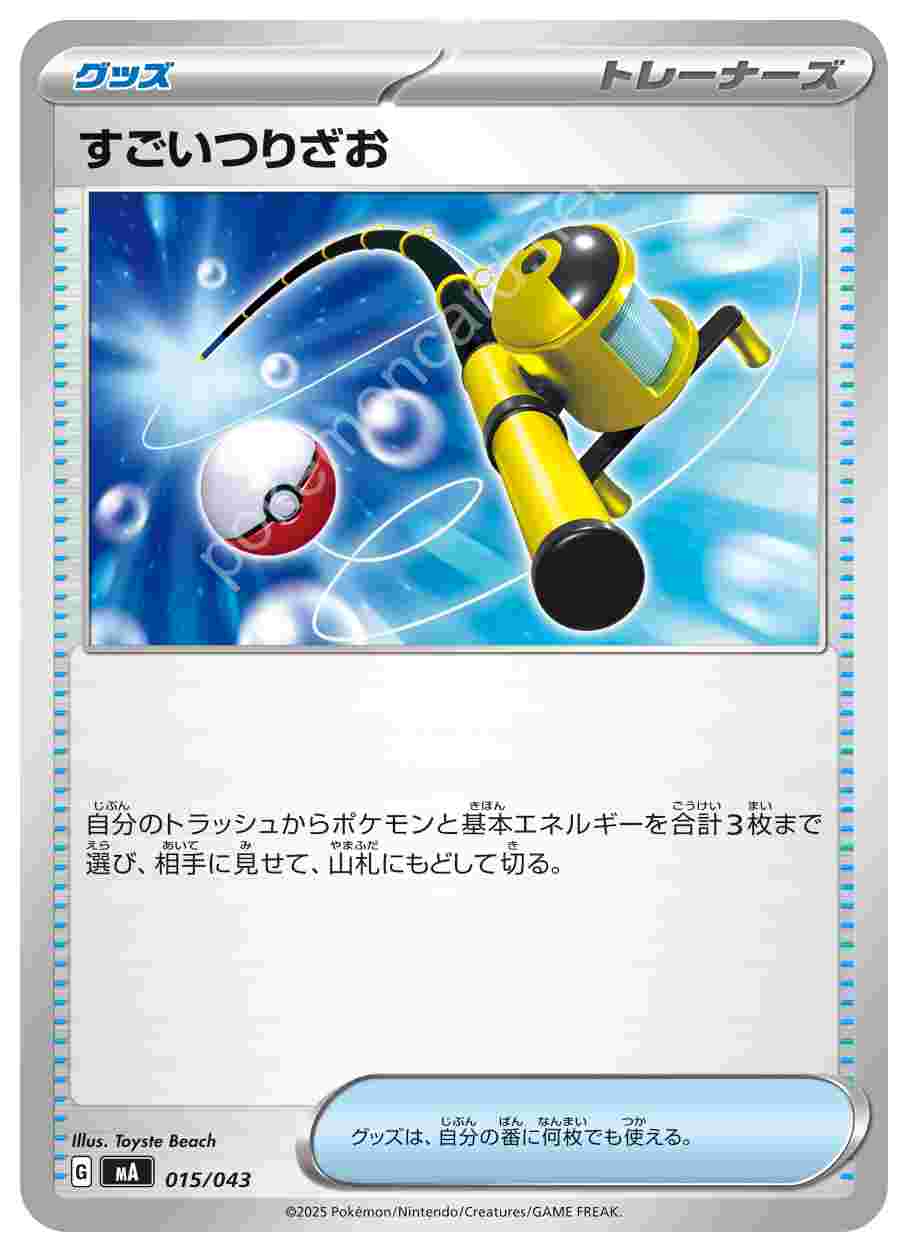 ![]() | すごいつりざお | グッズ | 自分のトラッシュからポケモンと基本エネルギーを合計3枚まで選び、相手に見せて、山札にもどして切る。グッズは、自分の番に何枚でも使える。 | プレミアムトレーナーボックスMEGA | ★★★ | 015/043 |