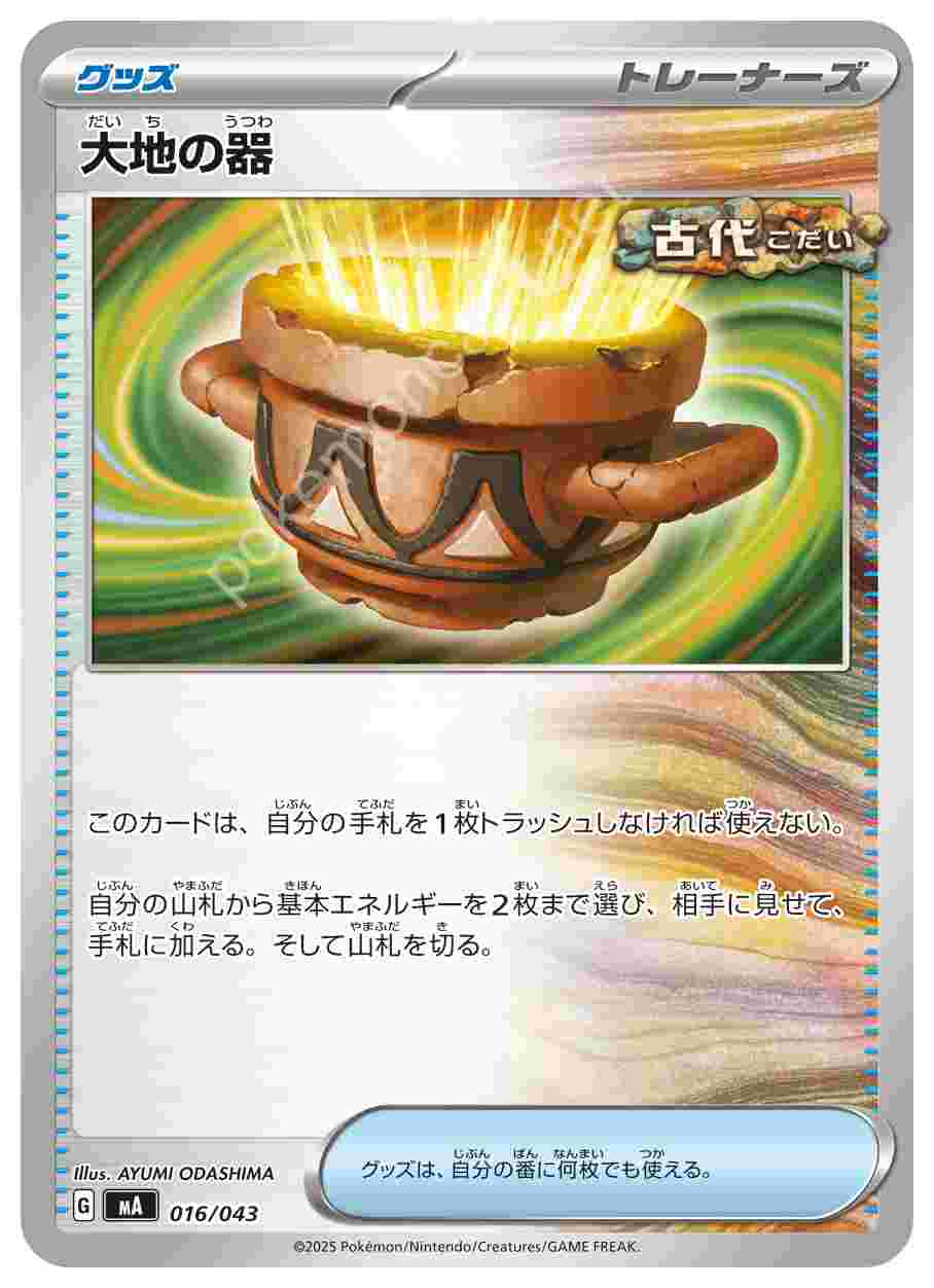 ![]() | 大地の器 | グッズ | このカードは、自分の手札を1枚トラッシュしなければ使えない。 自分の山札から基本エネルギーを2枚まで選び、相手に見せて、手札に加える。そして山札を切る。グッズは、自分の番に何枚でも使える。 | プレミアムトレーナーボックスMEGA | ★★★ | 016/043 |