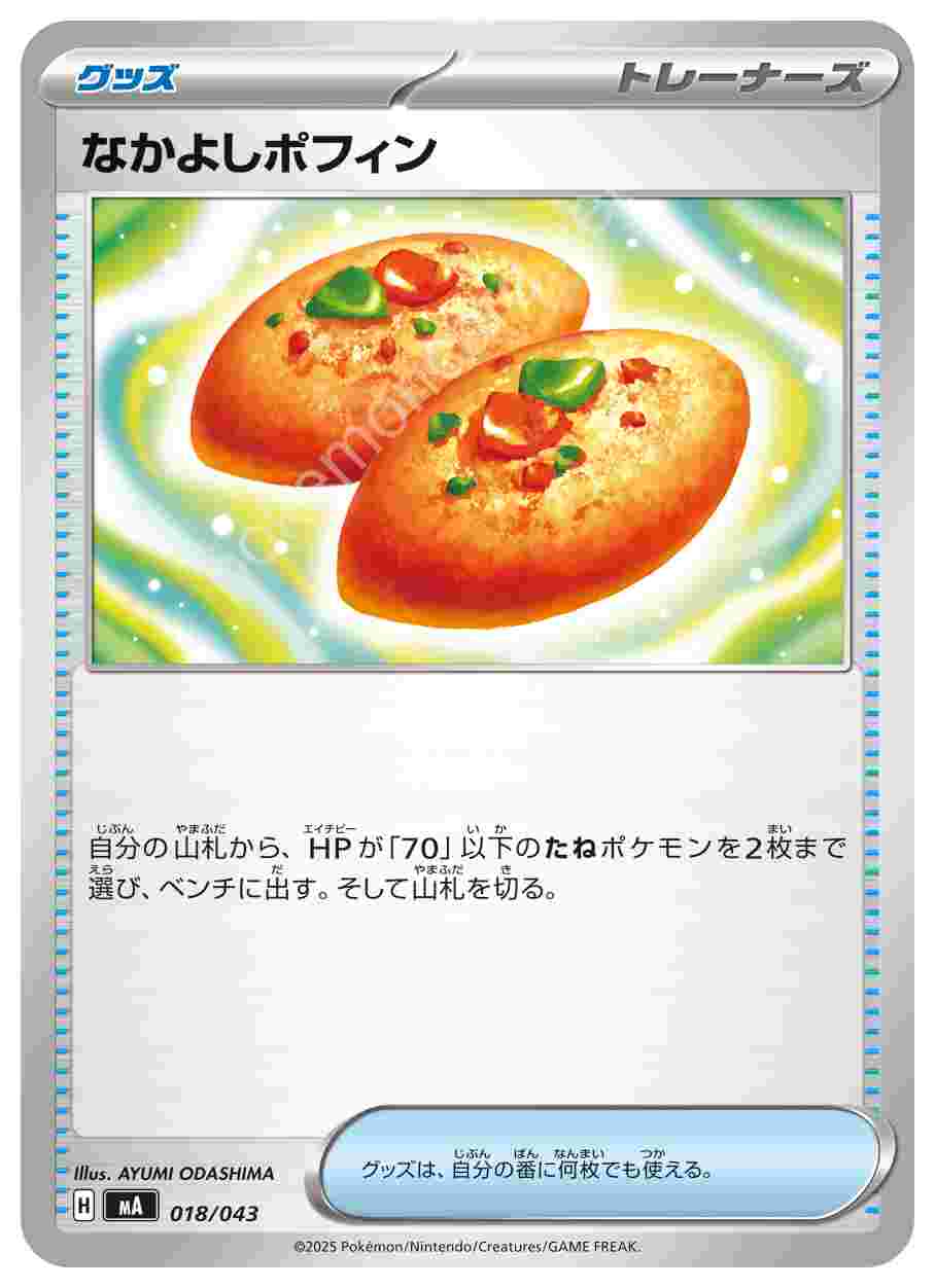 ![]() | なかよしポフィン | グッズ | 自分の山札から、HPが「70」以下のたねポケモンを2枚まで選び、ベンチに出す。そして山札を切る。グッズは、自分の番に何枚でも使える。 | プレミアムトレーナーボックスMEGA | ★★★ | 018/043 |