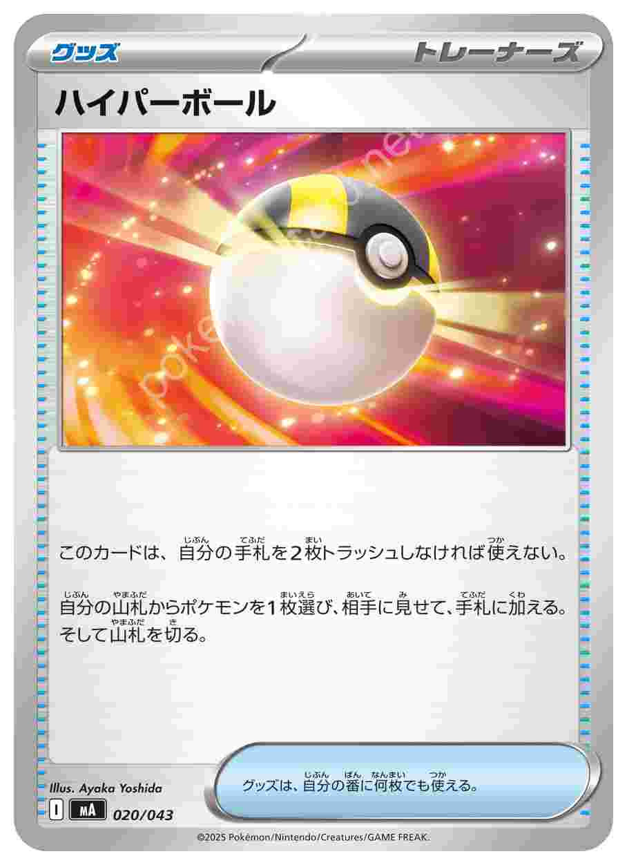 ![]() | ハイパーボール | グッズ | このカードは、自分の手札を2枚トラッシュしなければ使えない。 自分の山札からポケモンを1枚選び、相手に見せて、手札に加える。そして山札を切る。グッズは、自分の番に何枚でも使える。 | プレミアムトレーナーボックスMEGA | ★★★ | 020/043 |