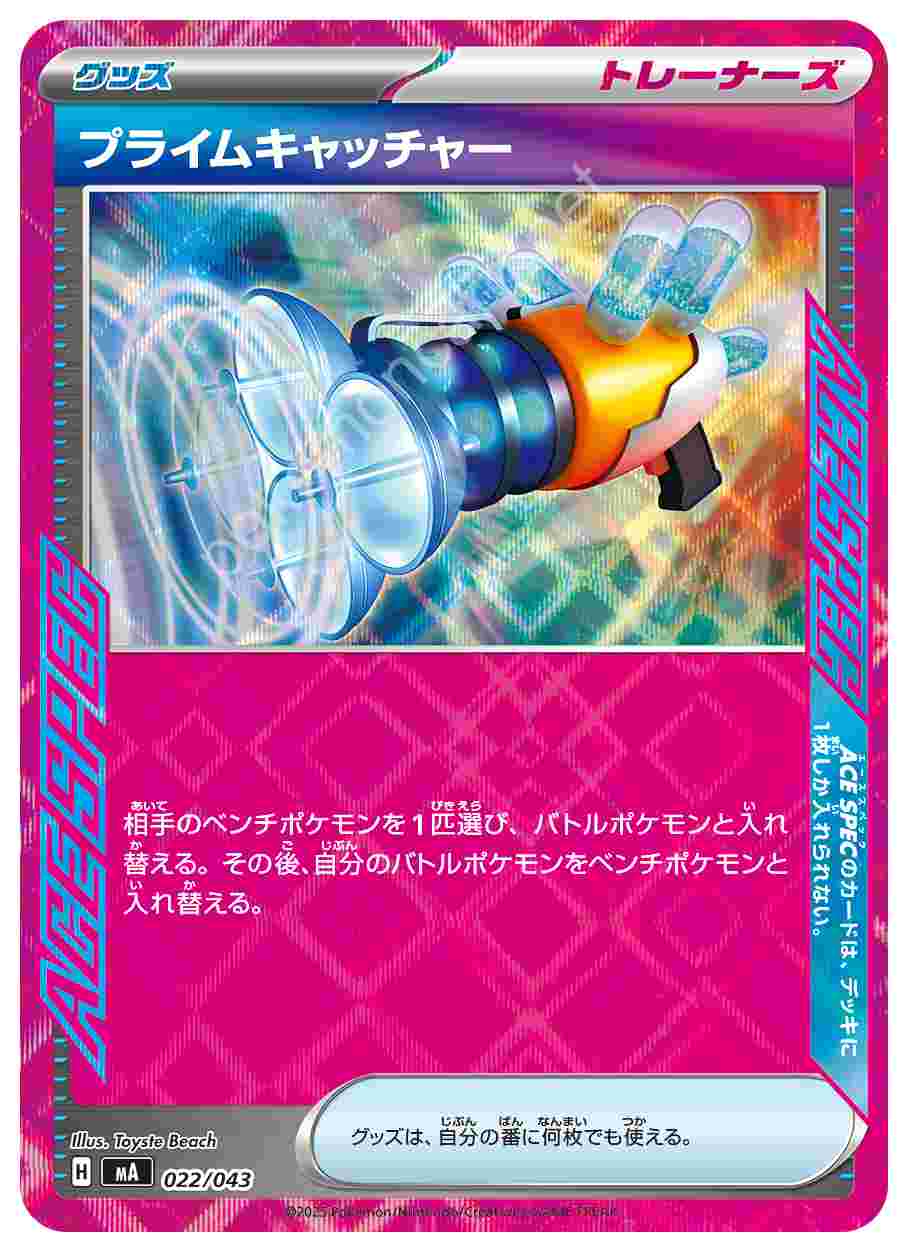 ![]() | プライムキャッチャー | グッズ | 相手のベンチポケモンを1匹選び、バトルポケモンと入れ替える。その後、自分のバトルポケモンをベンチポケモンと入れ替える。グッズは、自分の番に何枚でも使える。 特別なルール ACE SPECのカードは、デッキに1枚しか入れられない。ACE SPECのカードは、デッキに1枚しか入れられない。 | プレミアムトレーナーボックスMEGA | ★★★ | 022/043 |
