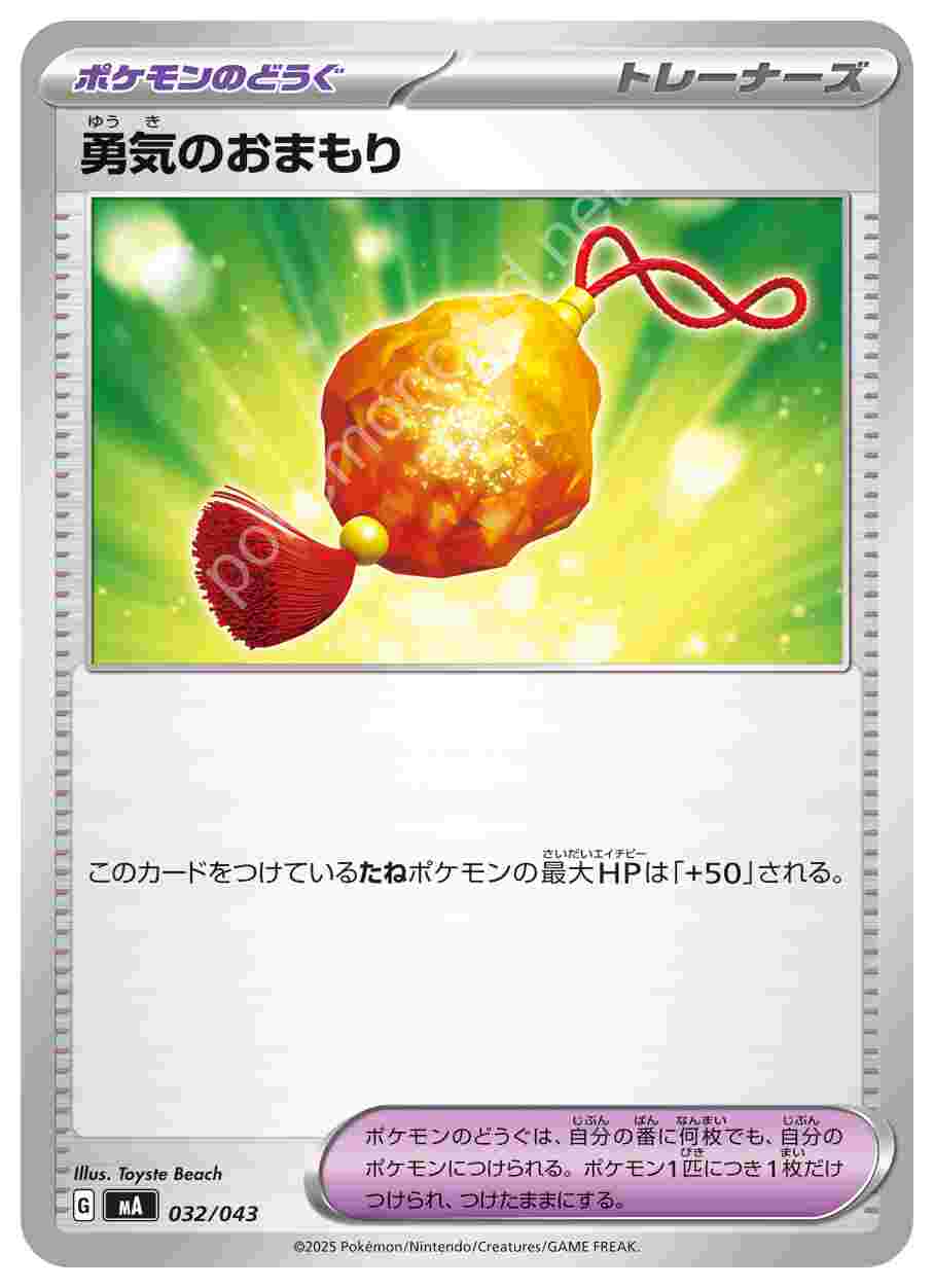 ![]() | 勇気のおまもり | ポケモンのどうぐ | このカードをつけているたねポケモンの最大HPは「+50」される。ポケモンのどうぐは、自分の番に何枚でも、自分のポケモンにつけられる。ポケモン1匹につき1枚だけつけられ、つけたままにする。 | プレミアムトレーナーボックスMEGA | ★★★ | 032/043 |