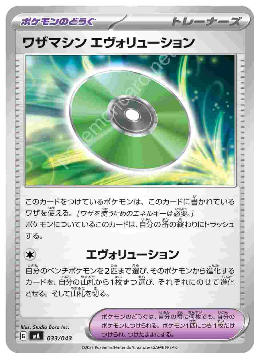 ![]() | ワザマシン エヴォリューション | ポケモンのどうぐ | このカードをつけているポケモンは、このカードに書かれているワザを使える。[ワザを使うためのエネルギーは必要。] ポケモンについているこのカードは、自分の番の終わりにトラッシュする。ポケモンのどうぐは、自分の番に何枚でも、自分のポケモンにつけられる。ポケモン1匹につき1枚だけつけられ、つけたままにする。 ワザ自分のベンチポケモンを2匹まで選び、そのポケモンから進化するカードを、自分の山札から1枚ずつ選び、それぞれにのせて進化させる。そして山札を切る。 | プレミアムトレーナーボックスMEGA | ★★★ | 033/043 |
