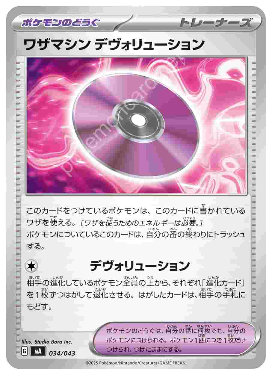 ![]() | ワザマシン デヴォリューション | ポケモンのどうぐ | このカードをつけているポケモンは、このカードに書かれているワザを使える。[ワザを使うためのエネルギーは必要。] ポケモンについているこのカードは、自分の番の終わりにトラッシュする。ポケモンのどうぐは、自分の番に何枚でも、自分のポケモンにつけられる。ポケモン1匹につき1枚だけつけられ、つけたままにする。 ワザ相手の進化しているポケモン全員の上から、それぞれ「進化カード」を1枚ずつはがして退化させる。はがしたカードは、相手の手札にもどす。 | プレミアムトレーナーボックスMEGA | ★★★ | 034/043 |