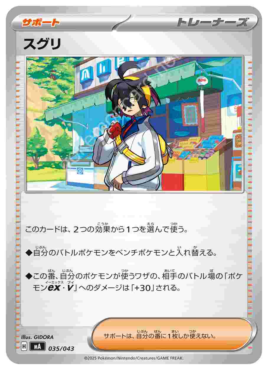 ![]() | スグリ | サポート | このカードは、2つの効果から1つを選んで使う。 ◆自分のバトルポケモンをベンチポケモンと入れ替える。 ◆この番、自分のポケモンが使うワザの、相手のバトル場の「ポケモンex・V」へのダメージは「+30」される。サポートは、自分の番に1枚しか使えない。 | プレミアムトレーナーボックスMEGA | ★★★ | 035/043 |