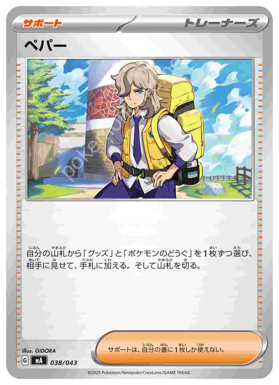 ![]() | ペパー | サポート | 自分の山札から「グッズ」と「ポケモンのどうぐ」を1枚ずつ選び、相手に見せて、手札に加える。そして山札を切る。サポートは、自分の番に1枚しか使えない。 | プレミアムトレーナーボックスMEGA | ★★★ | 038/043 |