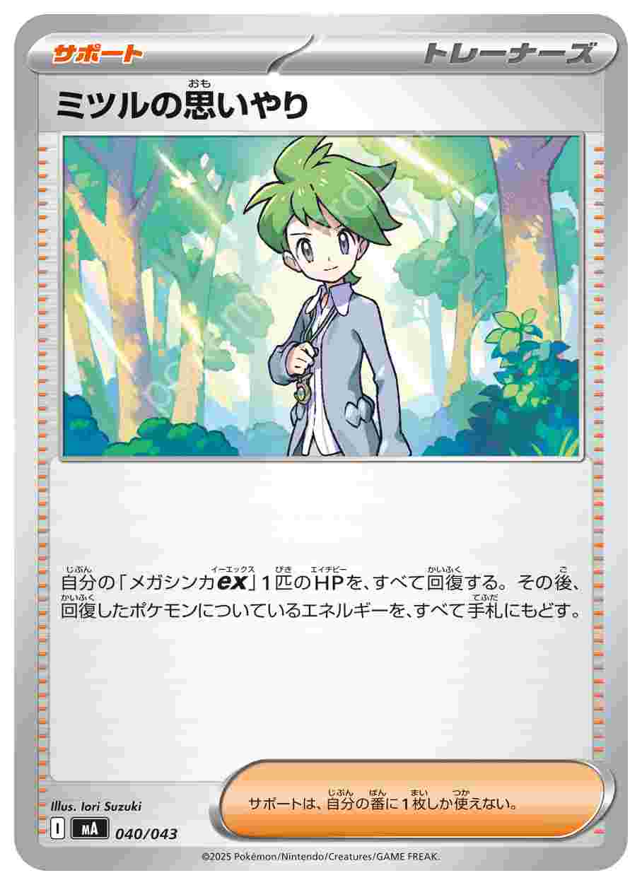 ![]() | ミツルの思いやり | サポート | 自分の「メガシンカex」1匹のHPを、すべて回復する。その後、回復したポケモンについているエネルギーを、すべて手札にもどす。サポートは、自分の番に1枚しか使えない。 | プレミアムトレーナーボックスMEGA | ★★★ | 040/043 |