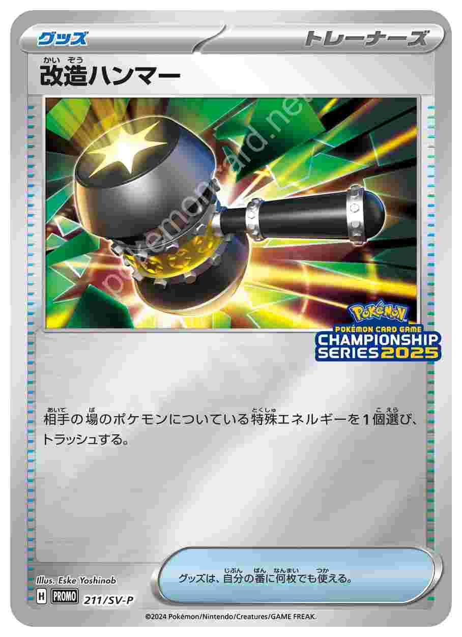 ![]() | 改造ハンマー | グッズ | 相手の場のポケモンについている特殊エネルギーを1個選び、トラッシュする。グッズは、自分の番に何枚でも使える。 | ポケモンカードゲームチャンピオンシップシリーズ2025 | ★★★ | 211/SV-P |