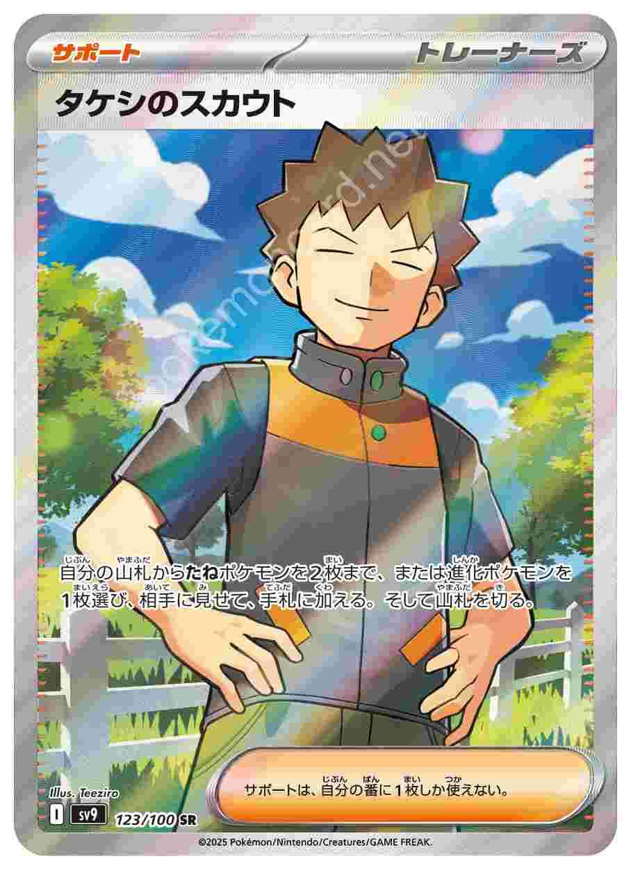 ![]() | タケシのスカウト | サポート | 自分の山札からたねポケモンを2枚まで、または進化ポケモンを1枚選び、相手に見せて、手札に加える。そして山札を切る。サポートは、自分の番に1枚しか使えない。 | 拡張パック「バトルパートナーズ」 | SR | 123/100 |